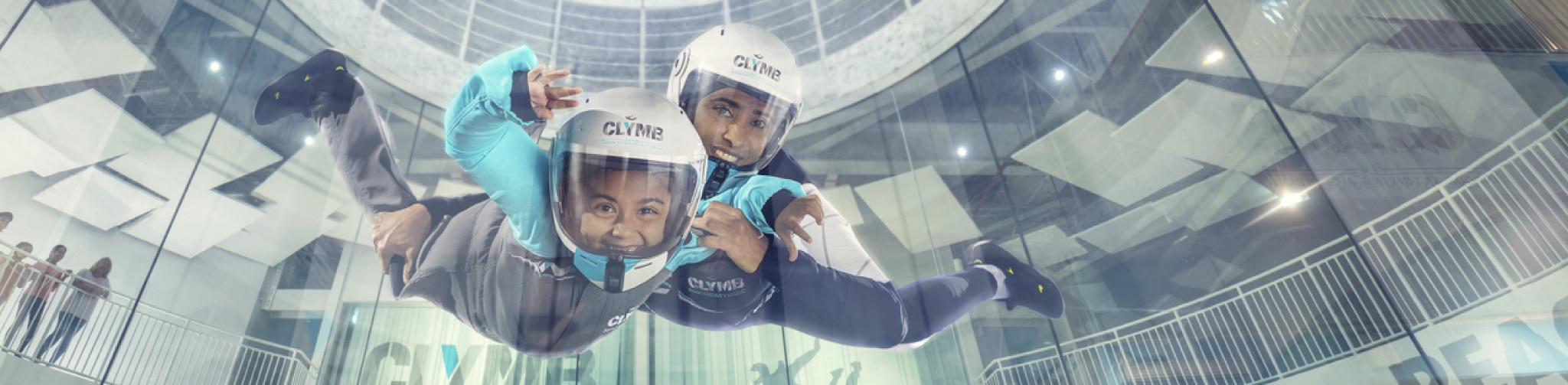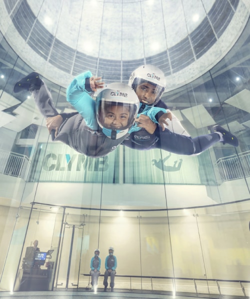 سيتاح للزوار تجربة أكبر نفق هوائي للقفز الحر الداخلي في العالم أو خوض تجربة التسلق للمبتدئين مع دخول إلى خمس جدران متفاوتة الارتفاع، منها أطول جدار تسلق داخلي في المنطقة. سيتولى مدربو كلايم المؤهلون إرشادكم وتوجيهكم خلال التجربة التي تختارونها.
